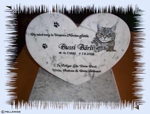 Am 20.Dezember 2008 haben Wir Unserer Pinky-Maus Unseren Letzten Liebesbeweis gemacht,und haben Sie zu Bärchen&Puppi in den Katzenhimmel Pfoteln lassen!-Pinky liegt neben Puppi und Bärli daß Sie gut schnurren können!-Dort wo einstweilen Dein Kreuz steht kommt dann Dein Grabstein hin Pinky!