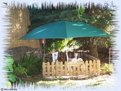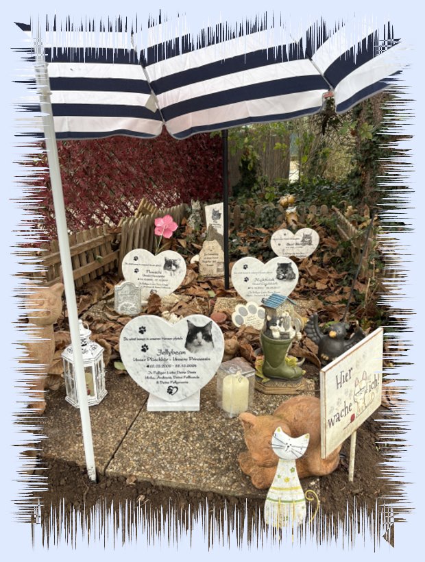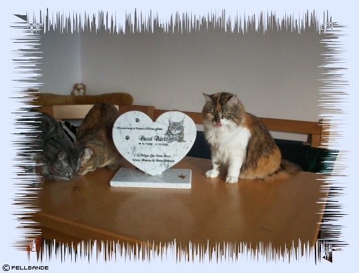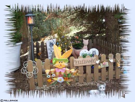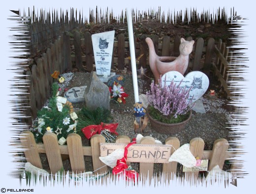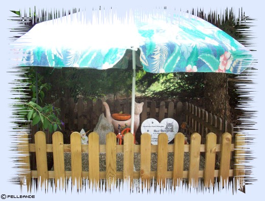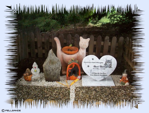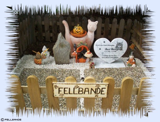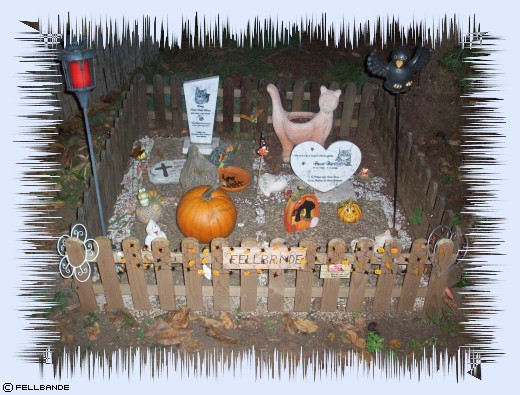 Am 18.September 2008 haben wir nun Bärli's & Puppi's Graberln Neu gemacht-Gleich im Felloweenstyle!-Felltränchen wieder gekullert,aber nun Fellige Freude!-Bärli's & Puppi's Gedenkstein,mit Asrael das ist Unser Rabe-die Fellige Verbindung zur anderen Seite in den Katzenhimmel,Laterne,Zaun,und Felloweensachen!-Und natürlich hat Fellbande sich zu Bärli's Gedenkstein gesetzt und Baba geschnurrt!