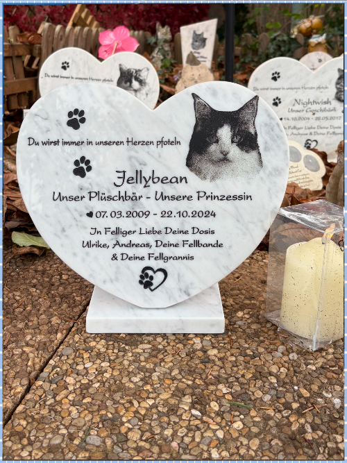 Jellybean hat noch Köpfchen gegeben, ganz laut geschnurrt, hat sich ganz fest an mich gedrückt und ist friedlich in meinen Armen eingeschlafen, und jetzt ist Sie "Nur" umgezogen! Sie schläft zu Hause, in unserem Garten neben ihren Freundinnen Flauschi, Nightwish und unseren anderen RB-Fellis Bärli, Pinky & Puppi, und für immer in unserem Herzen! Ihr Katzen Leben lang verwöhnt, unsere Prinzessin, das soll auch so bleiben! Immer bekommt "Jellybean" was für Ihr Fellgraberl Schenkis, Stecktiere, Neue Blumen, Kerzerln und auch Virtuelle Schenkis von Dosi, und von Unseren Fellgrannis! Felligen Dank dafür! *Dickeknuddelnasis*