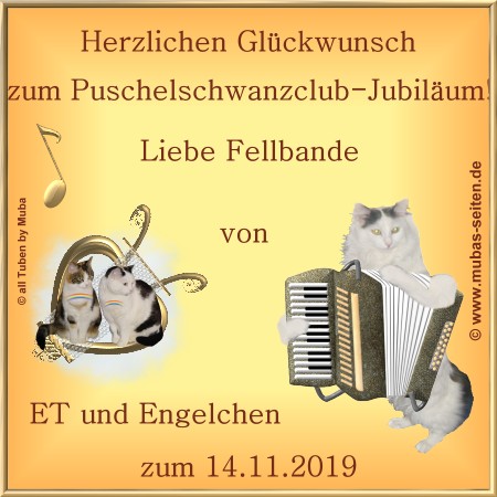 Hereingefellt!-Willkommenschnurren in Fellbandes Puschelschwanzverein!-Am 14.11.2006 hat Fellbandes Flauschi diesen Verein gegründet!-Ihr habt einen Puschelschwanz?-So einen richtigen Felligen Fellpuschelschwanz?-Superfellig!-Ihr wollt in Flauschi's Puschelschwanzverein?-Dann Schnurrt uns einfach ein Foto von Euch,bzw.von Eurem Puschelschwanz in der Größe 250x321 und Ihr seid dabei!-Einen Vereinsmitgliedsausweis bekommt Ihr dann natürlich auch!