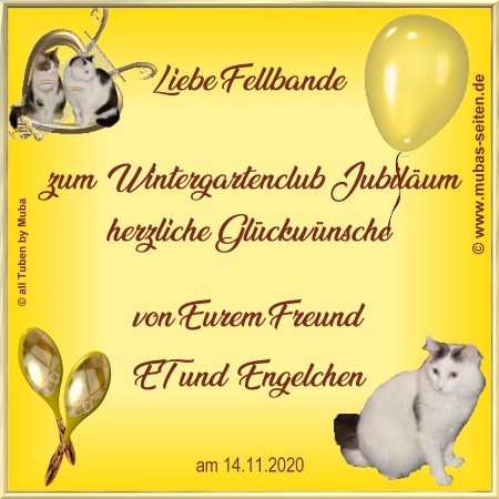 Schnurr!-Hereingepfotelt in Fellbandes Wintergartenclub den Fellbande am 14.11.2006 gegründet hat,-gestiftet von Unseren Fellgrannis!-*Schnurrendanke*-Egal ob es drausen warm oder kalt ist,hier drin ist es immer ganz Fellig gemütlich!-Es werden hier auch Ausflüge und Partys steigen!-Ihr wollt im Felligen Wintergartenclub dabei sein?-Krallt Euch die Vorlage-(das letzte Bild im Wintergartenclub oder ganz unten-(Bitte mit Links anpfoteln)-Bitte die Größe nicht verändern-Schnurrendanke)-setzt und richtet Euch gemütlich (r)ein,(darf ruhig auch animiert sein),und dann Schnurrt uns Euren Wintergarten!-Dann seid Ihr dabei in Fellbandes Wintergartenclub,und bekommt Euren Clubausweis dazu!